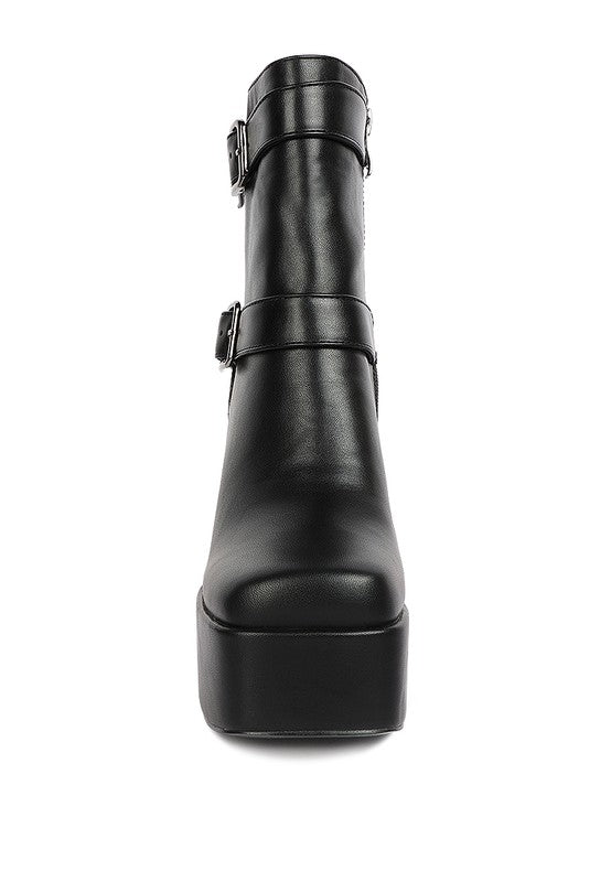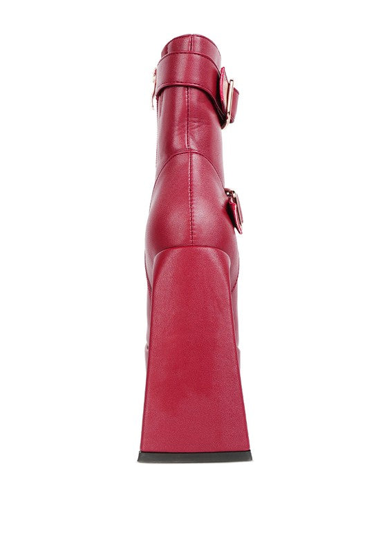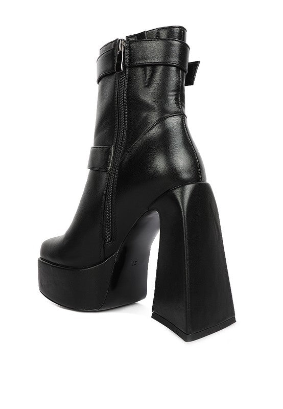 High Platform Ankle boot in trendy square cut toe, twin pin buckle detailed strap around the ankle looks alluring. It has cut out high block heels constructed on chunky high platform" A perfect visit to 80's inspired by current trend....