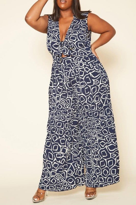 Effortless plus size women's jumpsuit in unique abstract print, v-neck style, tie front detail, sleeveless design and wide flare leg hem.(95% POLYESTER 5% SPANDEX) Moderate stretch Model Info: Height: 5'10" Bust: 42" Waist: 37" Hip: 54" Model is wearing 1XL